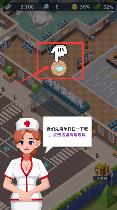 1、启动游戏后,根据系统提示点击外围杂物堆,完成环境整顿工作。