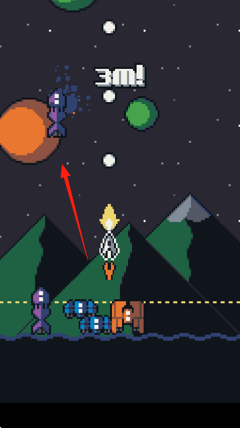 3、操控角色,在星球地表,按箭头,攻击紫色敌人,躲避障碍,积累分数、道具,推进太空冒险进程。