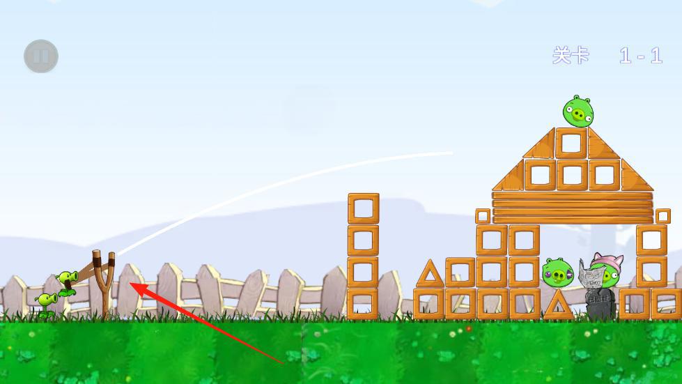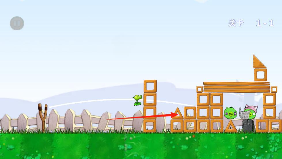 3、利用植物弹射,破坏小猪的木质建筑箭头指向目标点,消灭小猪,完成关卡,积累星星解锁新内容。