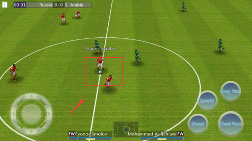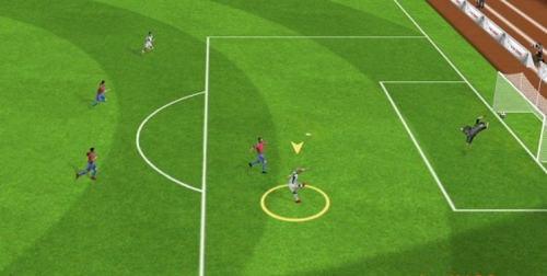 4、进入比赛场景后,通过虚拟摇杆控制球员移动,按键完成传球射门等技术动作。