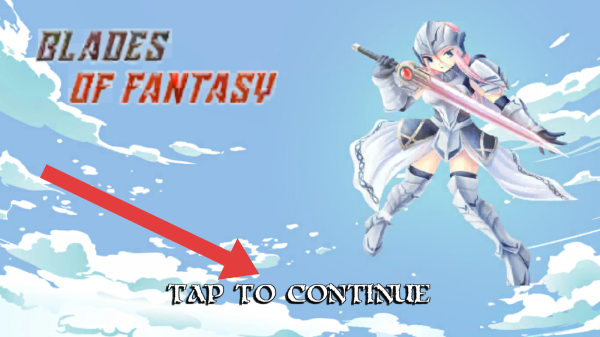 1、点击TAPTOCONTINUE进入游戏流程,画面中是持剑的角色,属于日式奇幻风格的动作或角色扮演类开局引导页面。