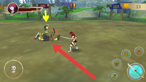 3、持剑玩家的战斗数值13,是伤害值、场景元素CASTE、GALUA标识的场地、金币数量、技能按钮等,属于角色扮演类的战斗环节。