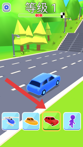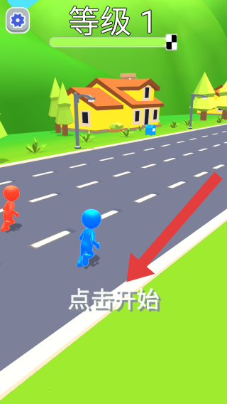 1、显示等级1,还有蓝色、红色小人角色,道路、房屋等场景元素,属于开始前的引导页面,点击开始可进入游戏关卡。