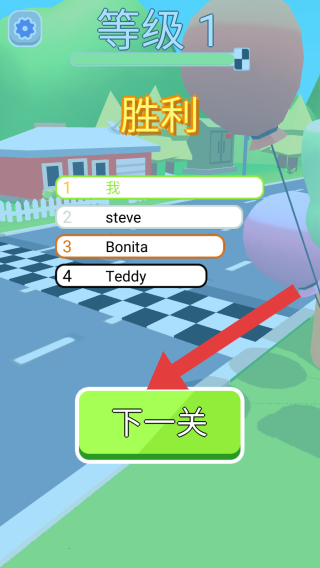 3、排名显示玩家我处于第一名,点击下一关的按钮,属于关卡结束后进入下一关的引导页面。