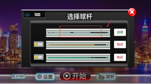 1、装备界面提供10余款专业球杆选择,每支球杆拥有独特的材质参数与击球特性。