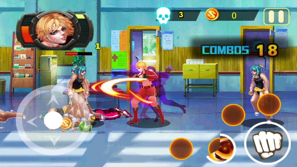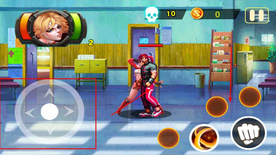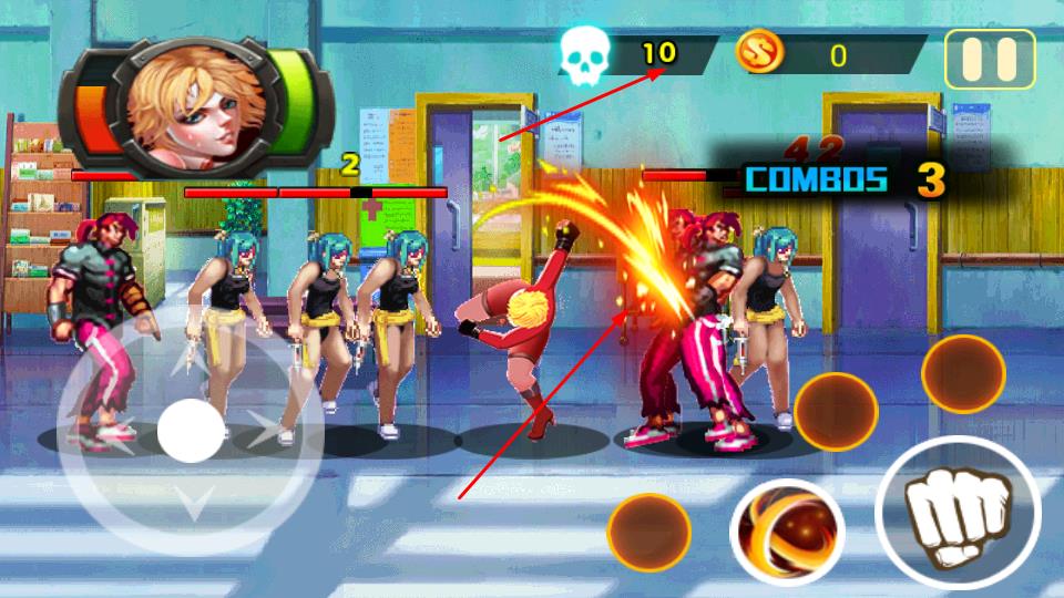 2、在格斗中操控左侧摇杆移动角色,点击右侧技能按键释放攻击,应对敌方如红装对手、蓝发群体进攻。