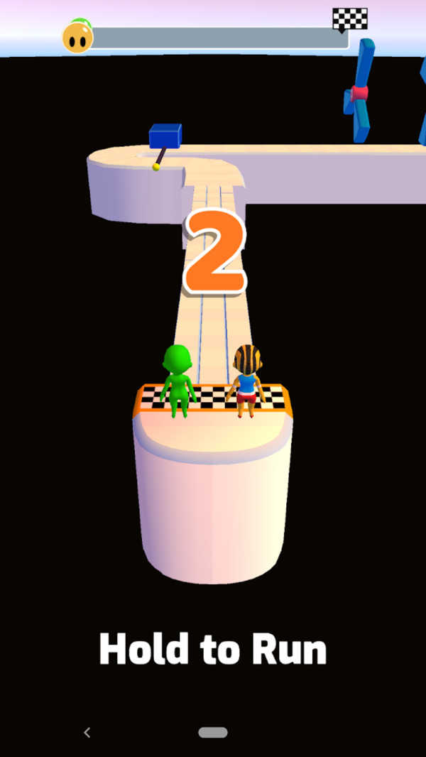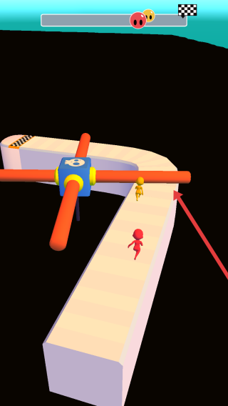 2、进入赛道后,操控角色灵活躲避旋转障碍物,和对手比拼速度,全力向终点的方格旗冲刺前进。
