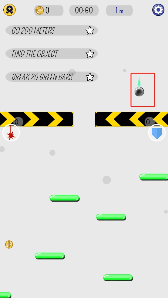 2、操控带火焰的黑色小球,通过跳跃踩踏绿色横条,完成左上角的任务,同时朝着目标推进,留意寻找场景内的目标物体。
