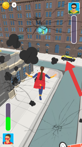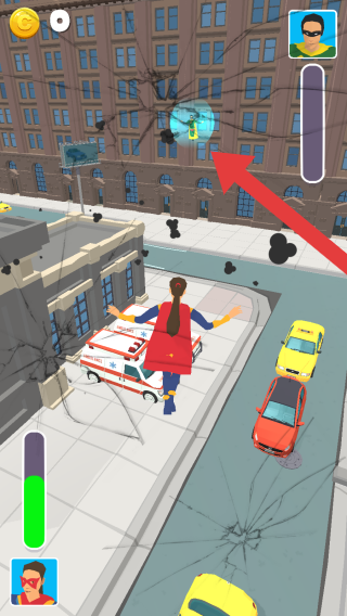 3、游戏资源显示金币、能量条,呈现英雄在城市中执行任务如救援、行动的情境,根据提示操作。