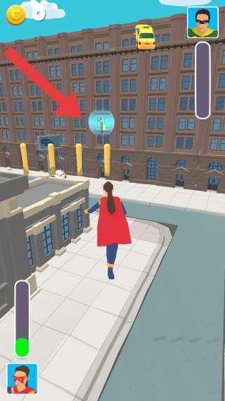 2、待救援的目标建筑窗户处发光的人物,还有金币、能量条、其他英雄等元素,需要将地面上的物品扔向其他玩家。