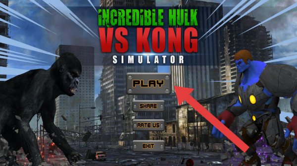 1、画面呈现了金刚和浩克在城市废墟场景中,点击PLAY方可开始游戏、以及SHARE、RATEUS、CHAT等交互按钮。