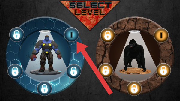 2、SELECTLEVEL选择关卡的标题,以及两个可选择的角色阵营,每个阵营有已解锁和未解锁的关卡,用于玩家选择关卡和操控对应角色。