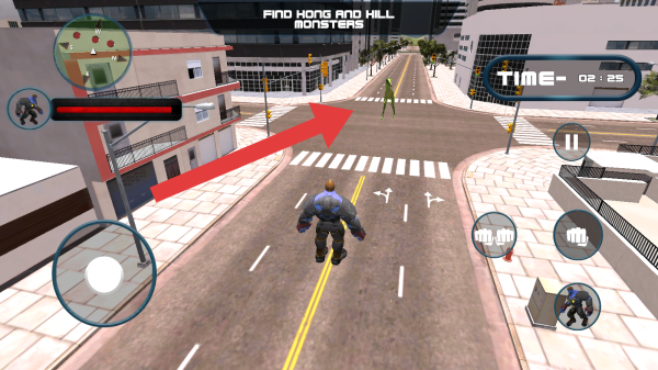 3、操作按钮:左下角移动摇杆、右侧技能/动作按钮等,画面呈现城市街道场景,玩家操控机甲风格角色执行寻找怪物任务。