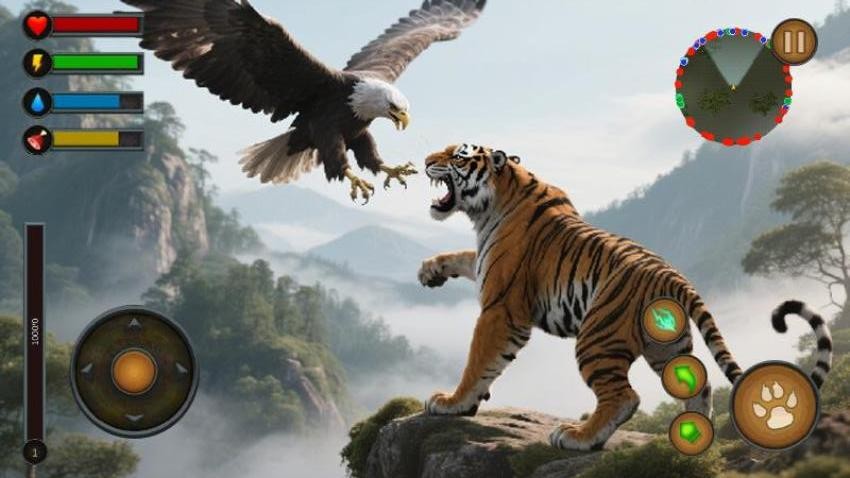 3、差异化对抗模式,对战老鹰需攀爬岩壁触发空中对决,面对象群则要诱导其冲撞破坏障碍物。每种动物弱点均有提示,但需玩家自行探索高效击败方式。