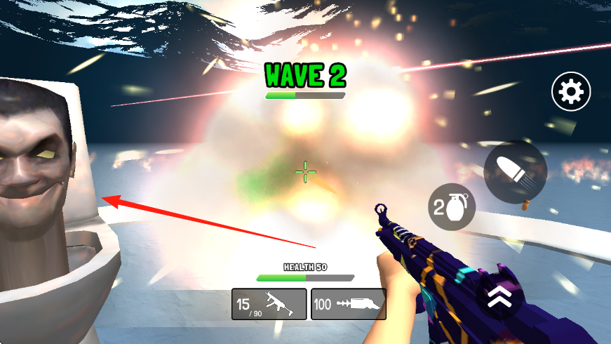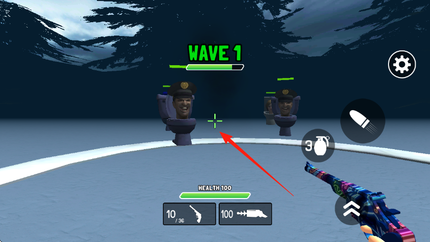 2、进入WAVE1,瞄准箭头指向的马桶人敌人,用枪械射击,优先攻击威胁大的目标,手雷可清群怪,维持血量。