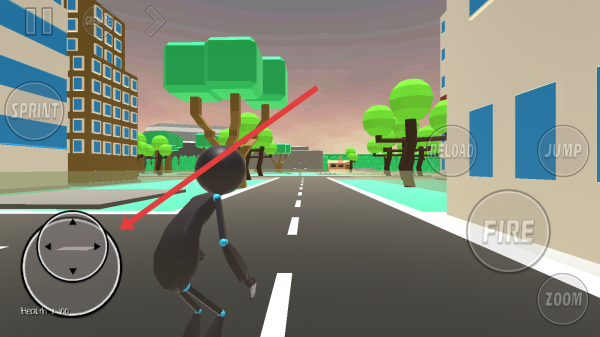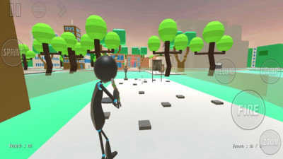 3、在进入游戏场景后,可以通过滑动左侧虚拟摇杆控制火柴人移动,在城市道路上开展行动。