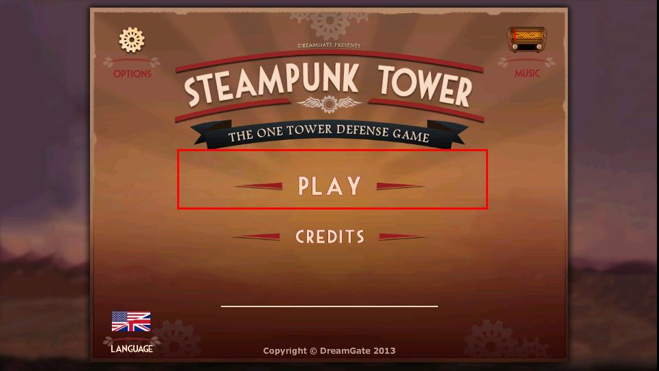 1、点击页面中间的PLAY按钮进入游戏,在蒸汽朋克风格场景中投身防御挑战操控塔楼应对敌人波次进攻,守护阵地。