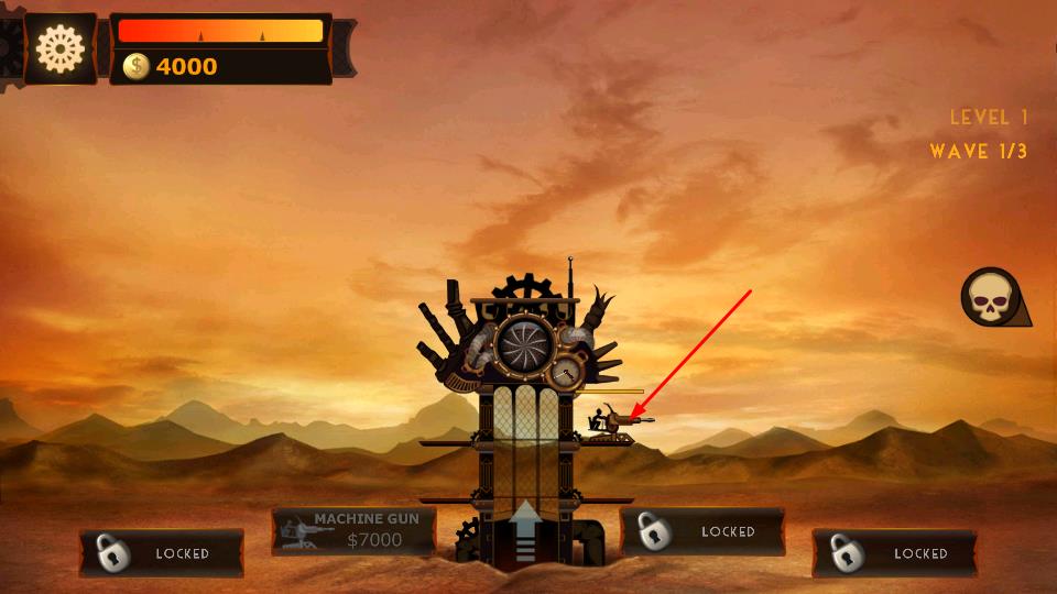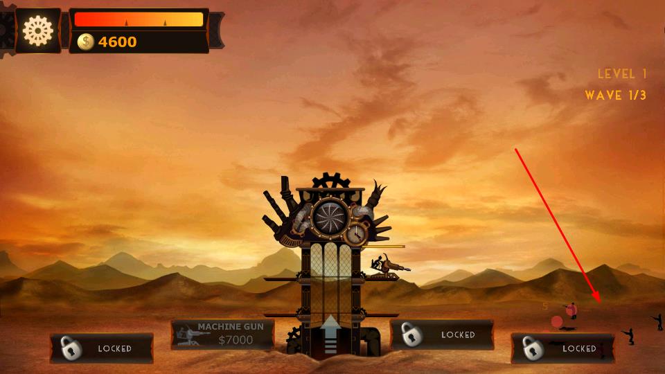 2、利用初始金币,可升级或解锁武器如Machine Gun,调整塔楼武器方向,同时能够精准打击来犯敌人。