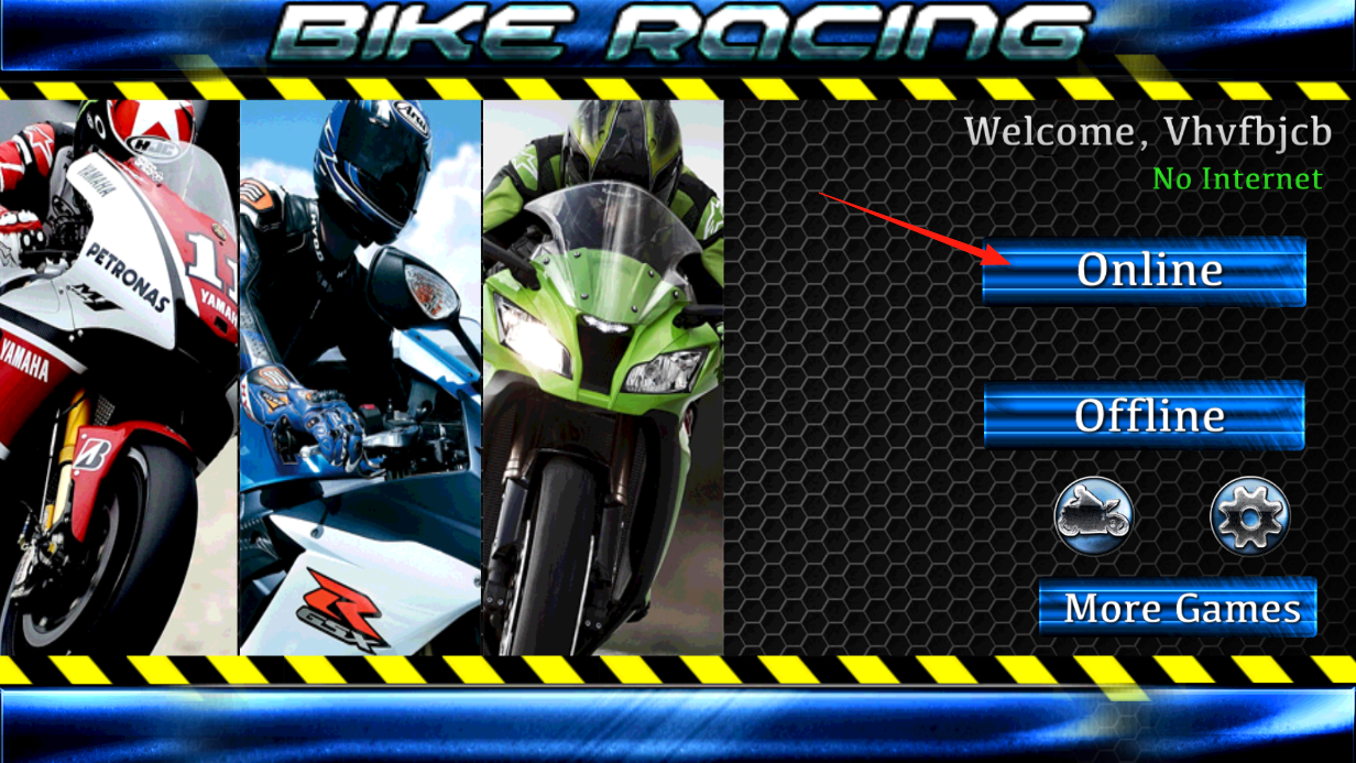 1、进入游戏主界面,看到Online和Offline选项,选择Online,匹配在线玩家,借助网络对战机制,体验实时竞技,通过选择操作,开启线上摩托竞速,感受多人对抗乐趣。