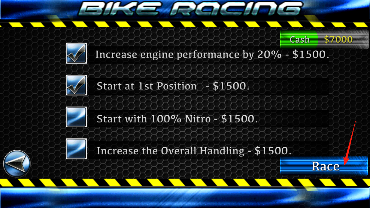 2、在升级界面,查看摩托强化项目,确认升级后,点击Race,进入比赛,利用强化增益,提升竞速优势,通过确认操作,开启赛道挑战,感受策略养成价值。
