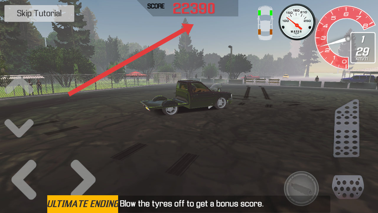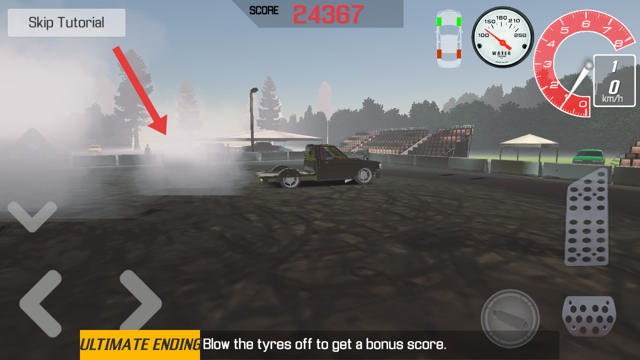3、猛踩油门后急刹,可以使轮胎摩擦冒烟,触发爆胎加分机制,借助提示文字冲击更高分数。