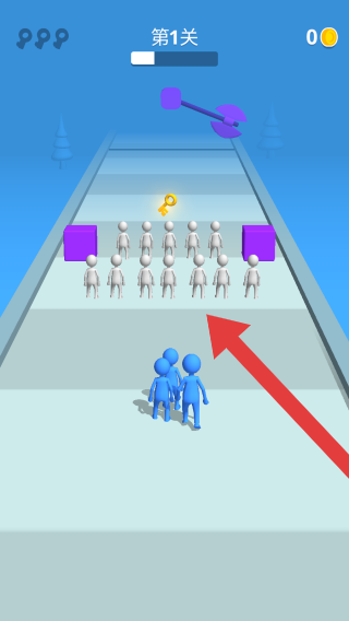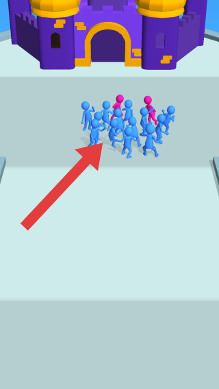 3、呈现蓝色火柴人队伍前进,目标是紫色城堡的场景,属于玩家操控火柴人群体突破障碍、进攻城堡的闯关玩法,展现团队推进的核心机制。