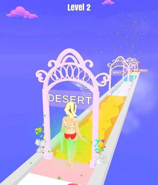 1、控制红框金发女孩,沿道路走向粉色拱门过关。