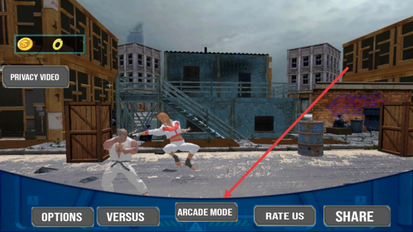 1、在游戏主界面,根据箭头指示点击ARCADE-MODE按钮,进入街机模式,开启格斗对战流程。