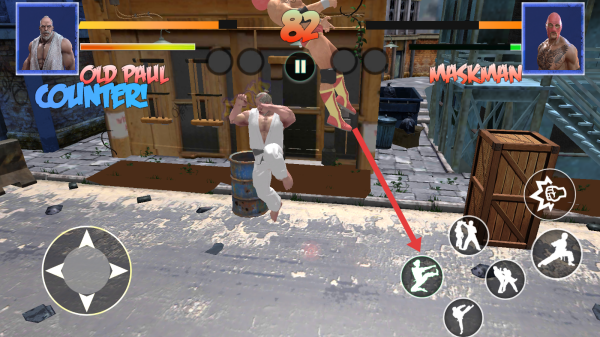 2、在对战时,需要通过左侧摇杆控制角色移动,调整与对手Old-Paul和Maskman的距离与方位。