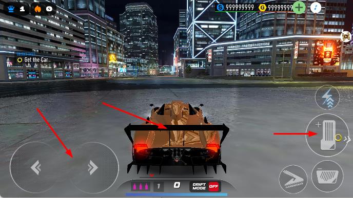 1、进入界面,操控金色赛车,用左侧虚拟按键控制方向,右侧按键调整功能,如氮气加速,在城市道路行驶。