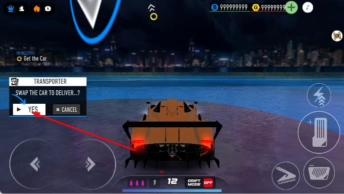 3、到达目标点,出现TRANSPORTER提示,点击YES完成车辆交付任务,获取奖励,继续挑战新剧情、赛道。