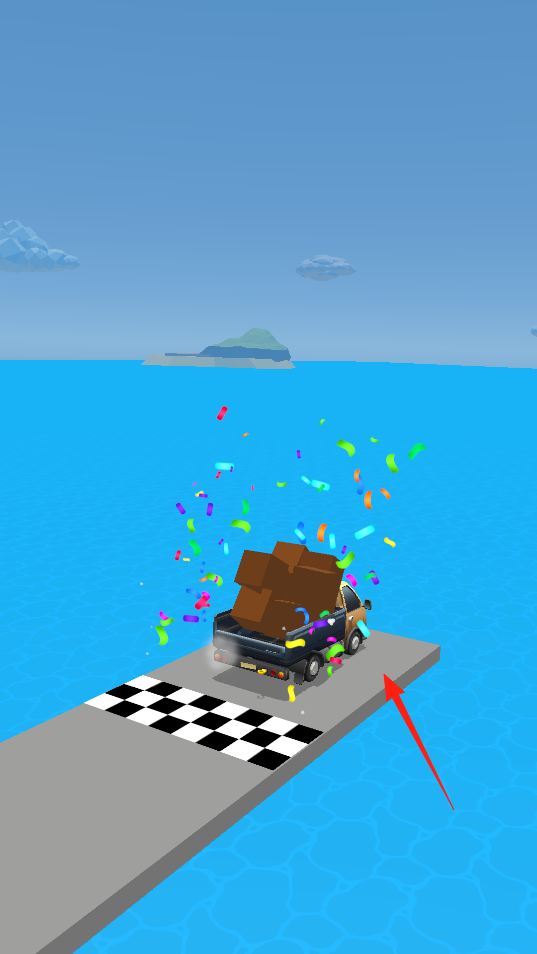 2、卡车抵达终点,触发彩纸特效,完成关卡目标,借助通关反馈机制,收获成就感,通过体验,感受目标达成的喜悦,为进入下一关做准备,延续驾驶玩法的乐趣。