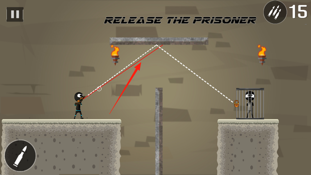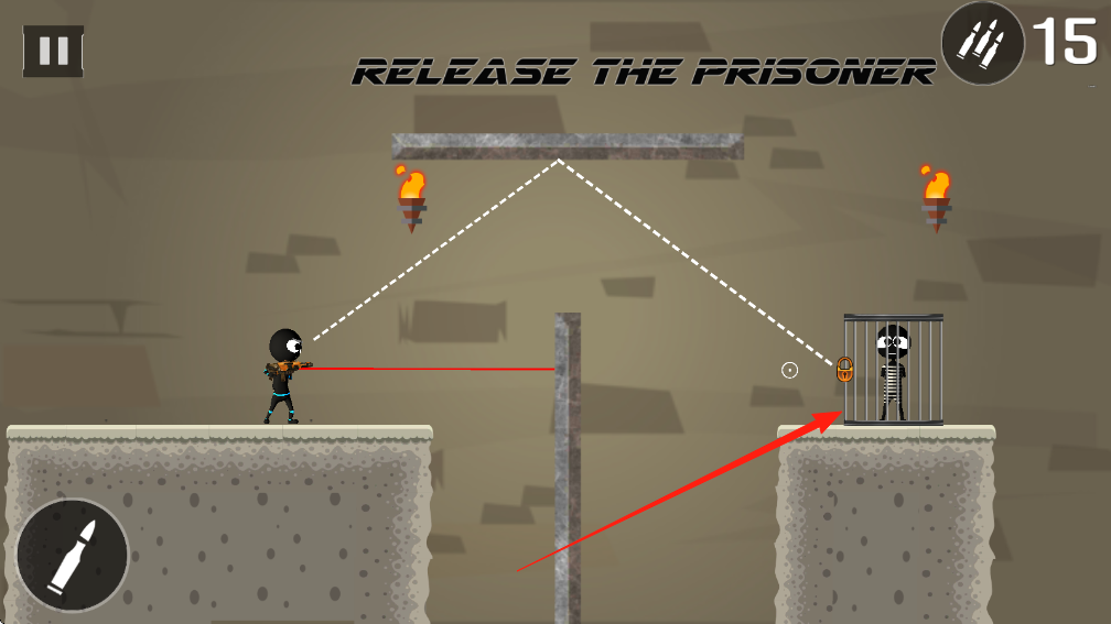 2、通过物理弹射,破坏笼子,释放囚犯,同时留意子弹数量15发等,避开障碍石柱,精准射击。
