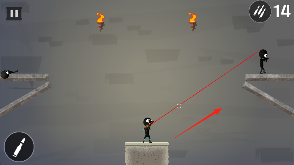 3、后续关卡如第三关,射击敌方火柴人,利用弹道反弹、场景机关,消灭对手,推进关卡,完成救援任务。