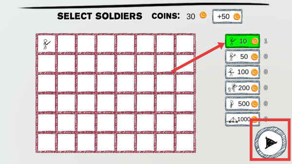 2、进入选兵界面,消耗金币选择士兵如10金币的兵种,布置到方格,点击右下角按钮开始战斗。