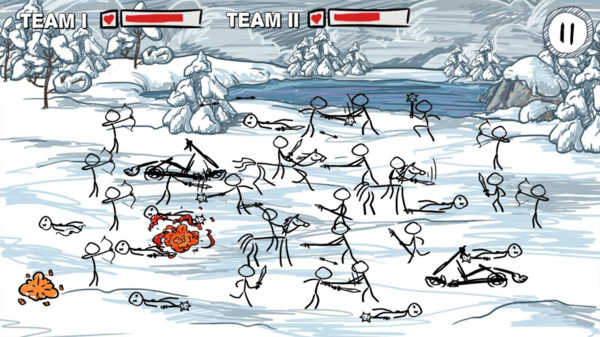2、趣味风格体验:滑稽的火柴人风格搭配卡通动漫画风,在紧张刺激的战争中融入欢乐元素,带给玩家无限欢乐与趣味,缓解战斗的严肃感。