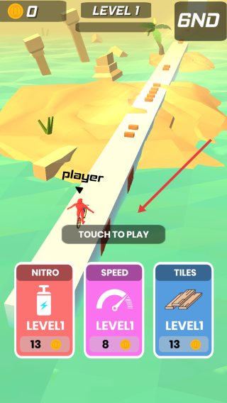 1、在游戏主界面点击TOUCH TO PLAY开始游戏,你可以利用nitro、speed和tiles等道具来提升游戏体验和表现。