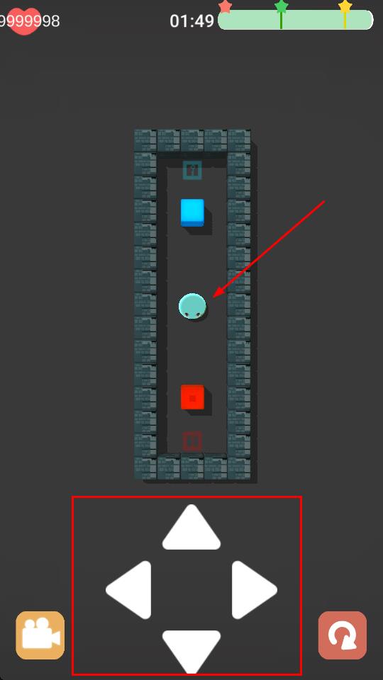 2、在关卡场景操控方向键,移动史莱姆,避开障碍,推动方块至对应位置,完成关卡任务。