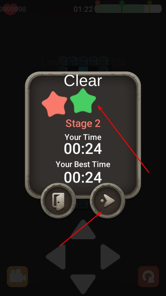 3、成功通关后查看Clear界面,若想继续挑战,点击右侧三角按钮,进入下一关Stage2。