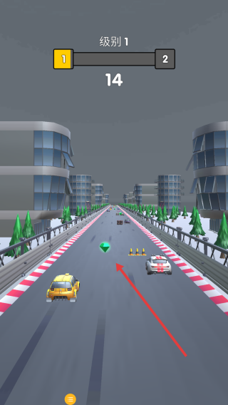 1、在级别1界面点击开始,进入赛车游戏,操控车辆在赛道上前进,收集绿色钻石。