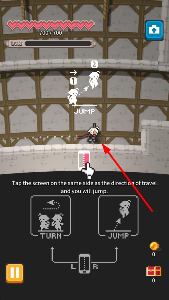 2、进入教程关卡中,点击屏幕使角色跳跃,箭头指向角色,跨越障碍前行。