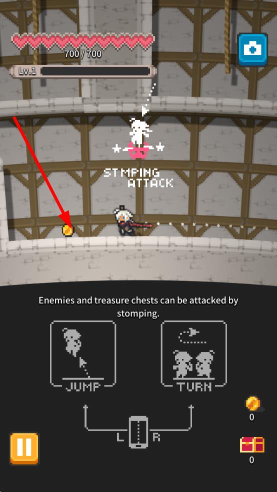 3、遇到敌人或宝箱,通过跳跃踩踏,指向金币,可尝试攻击获取,开启宝箱。