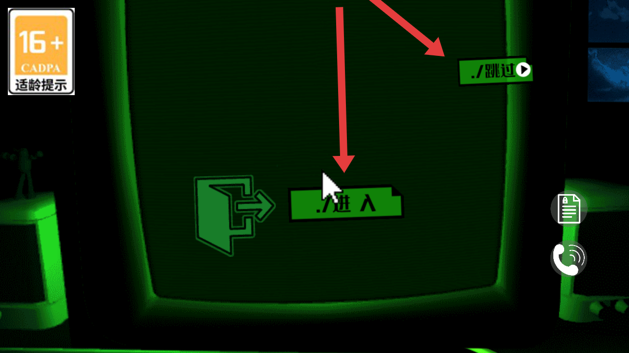 1、在游戏初始界面,点击绿色进入的按钮正式的开启游戏,也可以选择右上跳过略过这一关。