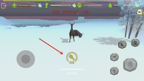 3、过程中可点击进食按钮恢复状态,利用技能按钮应对挑战,保障生存与任务完成。