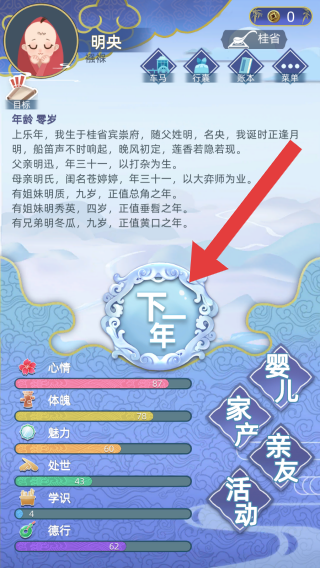 2、功能点击下一年按钮推进游戏时间,还有心情、体魄等属性值,以及家产、亲友、活动等功能入口,呈现角色基础信息与交互选项。