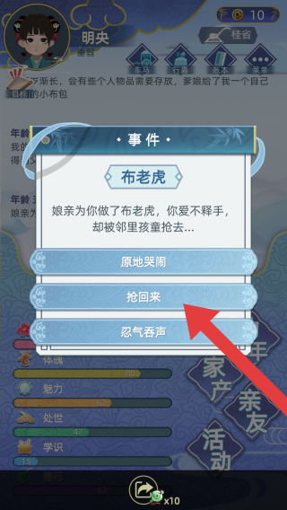 3、界面显示角色属性体魄、魅力等,功能入口家产、亲友、活动,呈现游戏中随机触发的生活事件及决策分支。