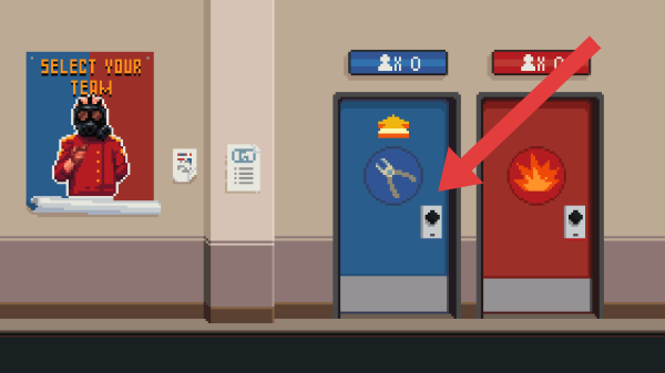 2、SELECTYOURTEAM!选择你的队伍!海报上有戴面具的角色,门上有火焰图案,呈现出场景交互元素。