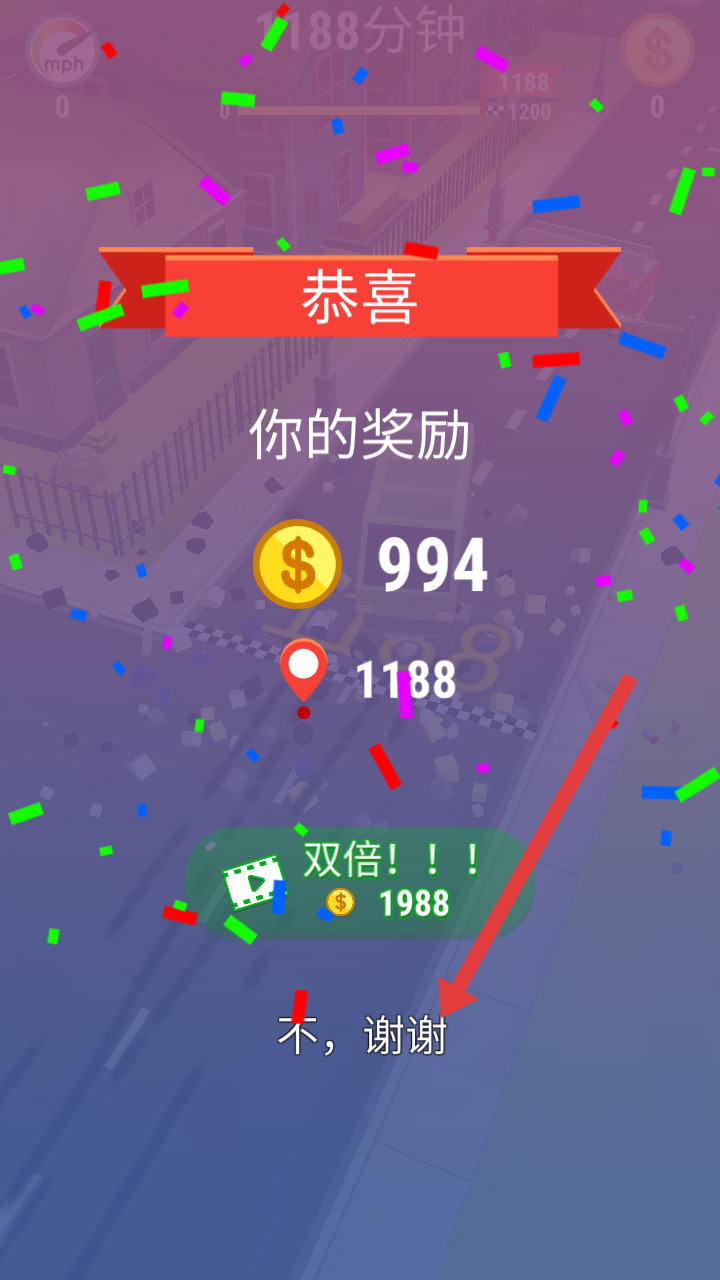 3、当关卡结束后,若不需要双倍的奖励,可以下载点击不,谢谢直接领取当前获得的金币奖励。