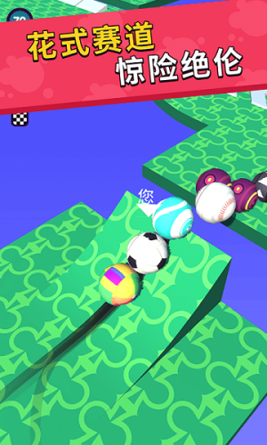 1、玩家通过点击屏幕控制球球转向,在复杂多变的赛道中灵活穿梭,需要精准判断路线并躲避障碍,同时寻找机会超越对手。