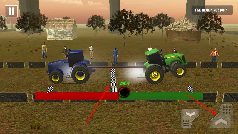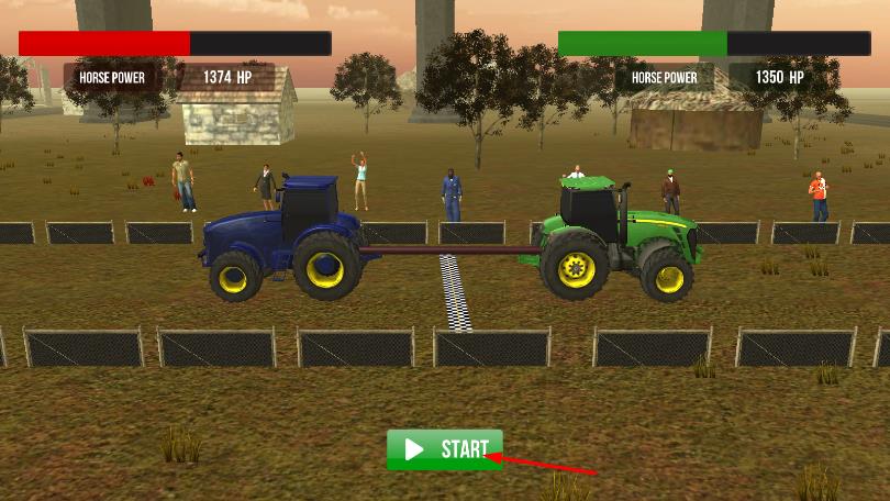 2、进入拔河对战,与蓝色拖拉机通过横杆连接,点击START开始,用虚拟按键控制拖拉机前进。